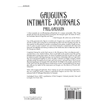 Review Modern artist Gauguin's journals, completed during his final years, appears in a fine reprint from a rare edition to provide Gauguin scholars with the painter's own thoughts and life. Surprisingly witty and revealing, these writings should appeal to any with even a casual interest in Gauguin's life or art. -- Midwest Book Review Read more Language Notes Text: English Original Language: French Read more From the Back Cover "These journals are an illuminating self-portrait of a unique personality.…They bring sharply into focus for me his goodness, his humor, his insurgent spirit, his clarity of vision, his inordinate hatred of hypocrisy and sham."—Emil Gauguin, the artist's son, in the Preface.One of the great innovative figures in modern art, Gauguin was a complex, driven individual who, in 1883, gave up his job as a stockbroker in order to be free to paint every day. As time passed, he determined to sacrifice everything for his artistic vocation. Finally, in pursuit of a place to paint "natural men and women living lives unstained by the sham and hypocrisy of civilization, he took up residence in the South Seas, first in Tahiti and, later, in the Marquesas Islands.Completed during the artist's final sojourn in the Marquesas, these revealing journals — reprinted from rare limited edition — throw much light on the painter's inner life and his thoughts about a great many topics. We learn of Gauguin's first stay in Paris in 1876, and his initial encounter with Impressionism, his tumultuous relationship with van Gogh when they lived and painted together in Arles, his pithy evaluations of Degas, Cèzanne, Manet, and other artists; his opinion of art dealers and critics (poor), and much more. Also here are illuminating glimpses of Gauguin's life in the islands: his delight in the simple, carefree lives of the natives and the physical charms of Polynesian women, counterbalanced by his struggles with poverty, hatred of the missionaries, and despair over the failures of French colonial justice.Witty, wide-ranging, and aphoristic, these writings are not only entertaining in themselves, they are crucial for anyone seeking to understand Gauguin and his work. The text is enhanced with 27 full-page illustrations by Gauguin.Dover (1997) unabridged republication of Paul Gauguin's Intimate Journals, Boni and Liveright, New York, 1921. Read more